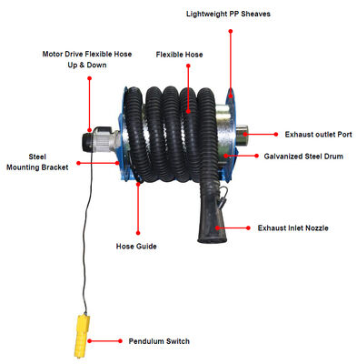 The Professional Spring Hose Reel is a heavy-duty exhaust management system designed for automotive and industrial applications. This manual control Spring Hose Reel utilizes a maintenance-free spring mechanism to provide reliable exhaust extraction from all vehicle types. Engineered for automotive repair shops, welding facilities, shipyards, and personal workshops, this durable system combines traditional reliability with modern efficiency.