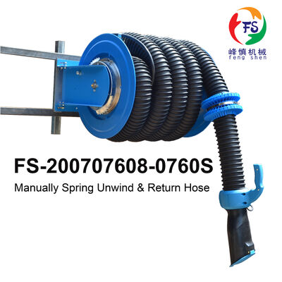 Manual spring operated reels work best in applications where the hose reel is within reaching distance of the operator. Simply pull down the hose to the desired length and attach the exhaust nozzle to the tailpipe. After successfully removing car exhaust from your space, the hose easily retracts back into the reel.