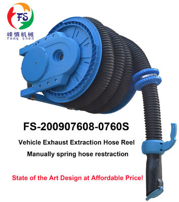 The hose of FS-2009 Spring Retraction Series unwinds and returns by spring. Simply pull down the hose to the desired length and attach the exhaust nozzle to the vehicle tailpipe. After successfully removing car exhaust gas (fume) from your space, pull down the hose a little, the spring will recoil the hose back into the reel.