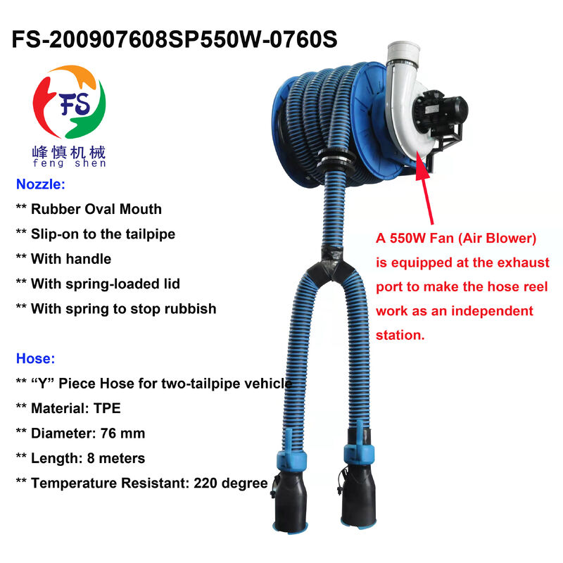 FS-200907608SP550W-0760S is manual spring unwind and return hose reel. Simply pull down the hose to the desired length and attach the exhaust nozzle to the vehicle tailpipe. After successfully removing car exhaust gas (fume) from your space, the hose easily retracts back into the reel.
