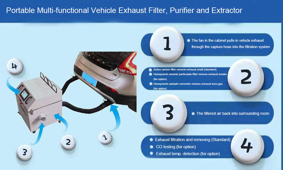 Semi-Automatic Operation for Engine Testing: Specifically designed to connect directly to a vehicle's tailpipe, it safely facilitates extended indoor engine runs for diagnostics, tuning, emissions checks, or cold-weather warm-ups, effectively purifying exhaust before release.